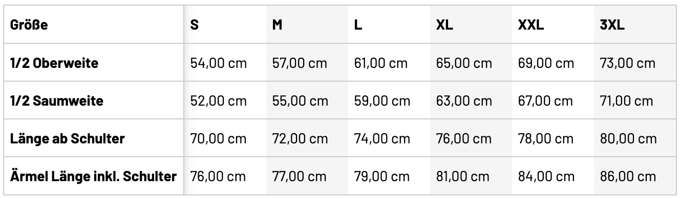 | Ärmel Länge inkl. Schulter | 76 | 77 | 79 | 81 | 84 | 86 |