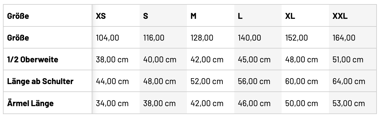 XS (104) S (116) M (128) L (140) XL (152) XXL (164)