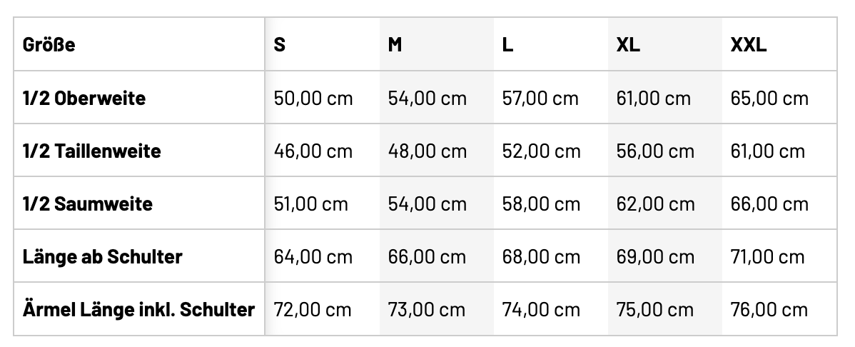 | Ärmel Länge inkl. Schulter | 72 | 73 | 74 | 75 | 76 |